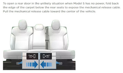 - Model S rear door: "fold back the edge of the carpet" to find a pull cable